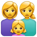 Emojis may look different across platforms. Each web service, OS, or gadget manufacturer can create an Emoji design according to their corporate style and vision. Here, you can check out what the 👩👩👧 Family: Woman, Woman, Girl Emoji looks like on the most popular platforms: